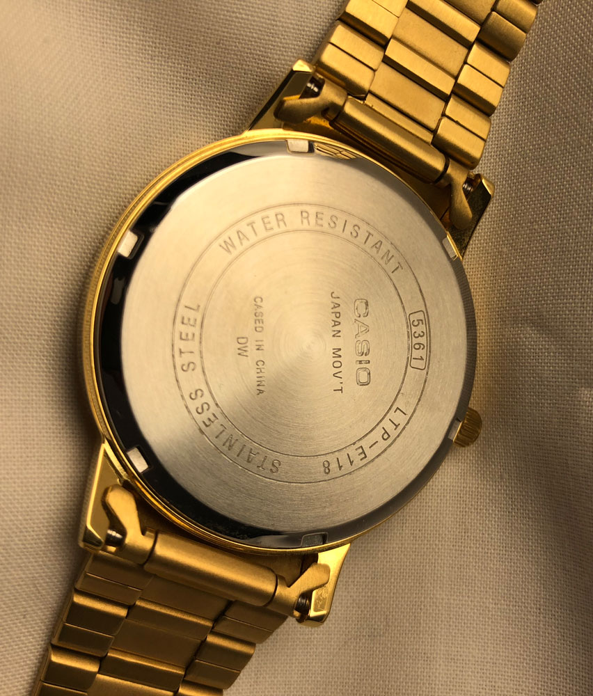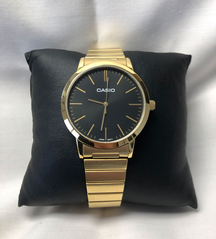 Casio Classic Vintage Style LTP-E118G-1AEF is an amazing and very impressive Gents watch. Case material is PVD Gold plated and the Black dial gives the watch that unique look. This watch is market as water resistant. It means it can withstand slight splashes and rain, but is NOT to be immersed in water.